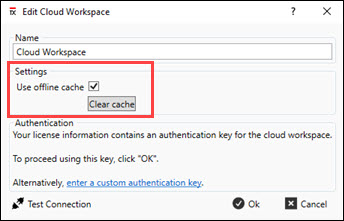 Having the offline cache activated, the status of the connectivity is displayed next to the workspace location name in the main window, top-left: